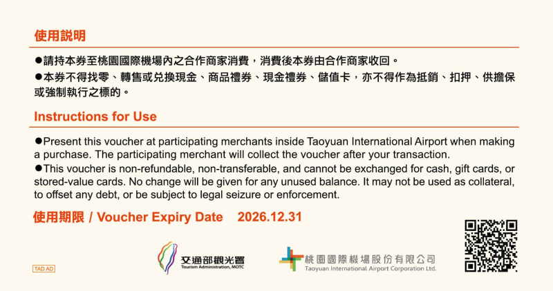 En tant que principale porte d’entrée internationale du pays, l’aéroport de Taoyuan accueille un grand nombre de passagers en transit. À travers cette campagne de bons-cadeaux, la TTA souhaite encourager davantage de voyageurs à profiter de leur escale pour découvrir la gastronomie, la culture et les services taïwanais. L’opération vise également à stimuler les activités commerciales au sein de l’aéroport et à favoriser le développement diversifié de l’économie touristique taïwanaise.